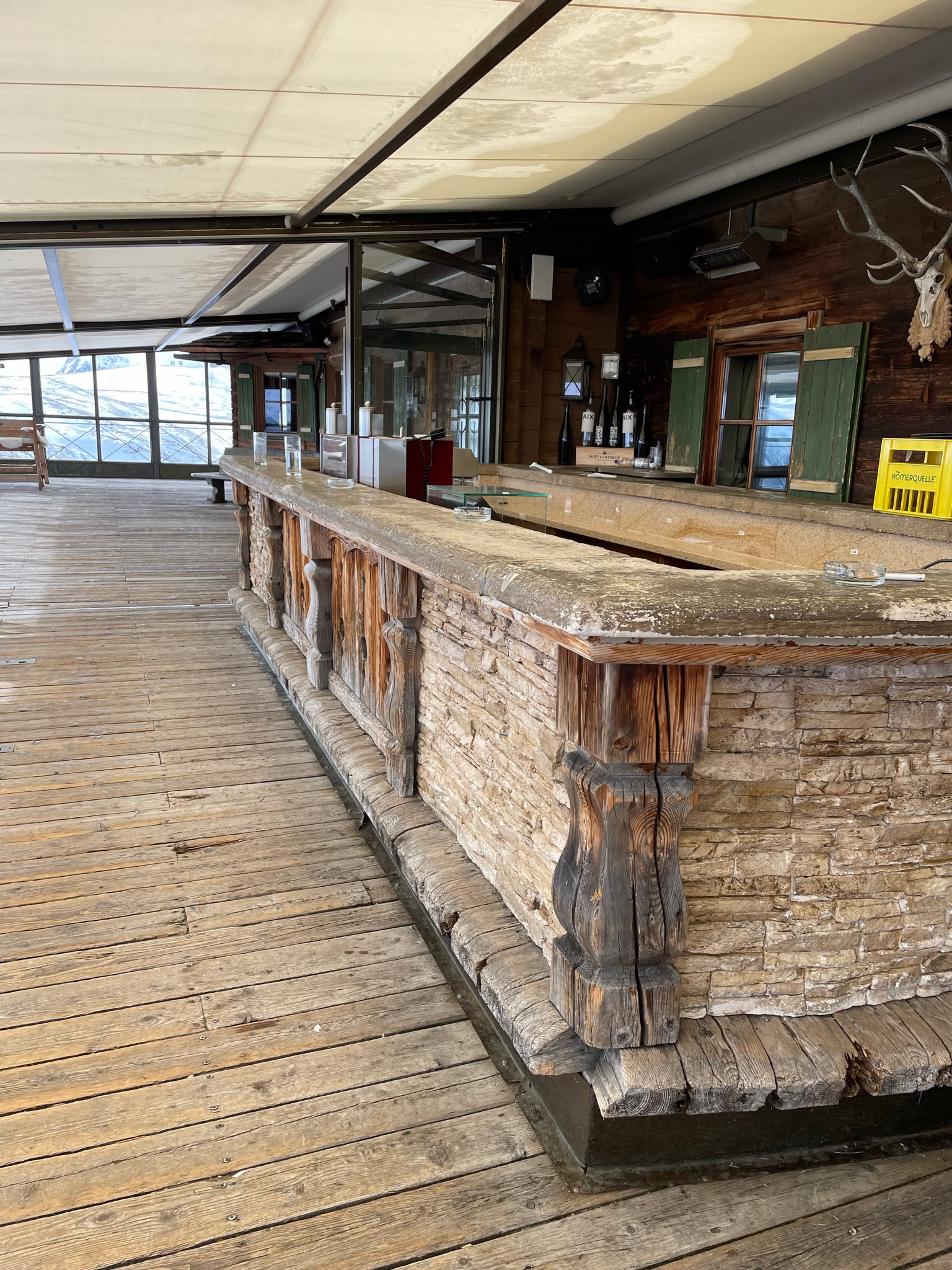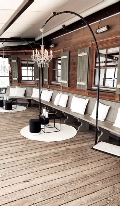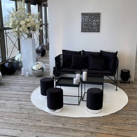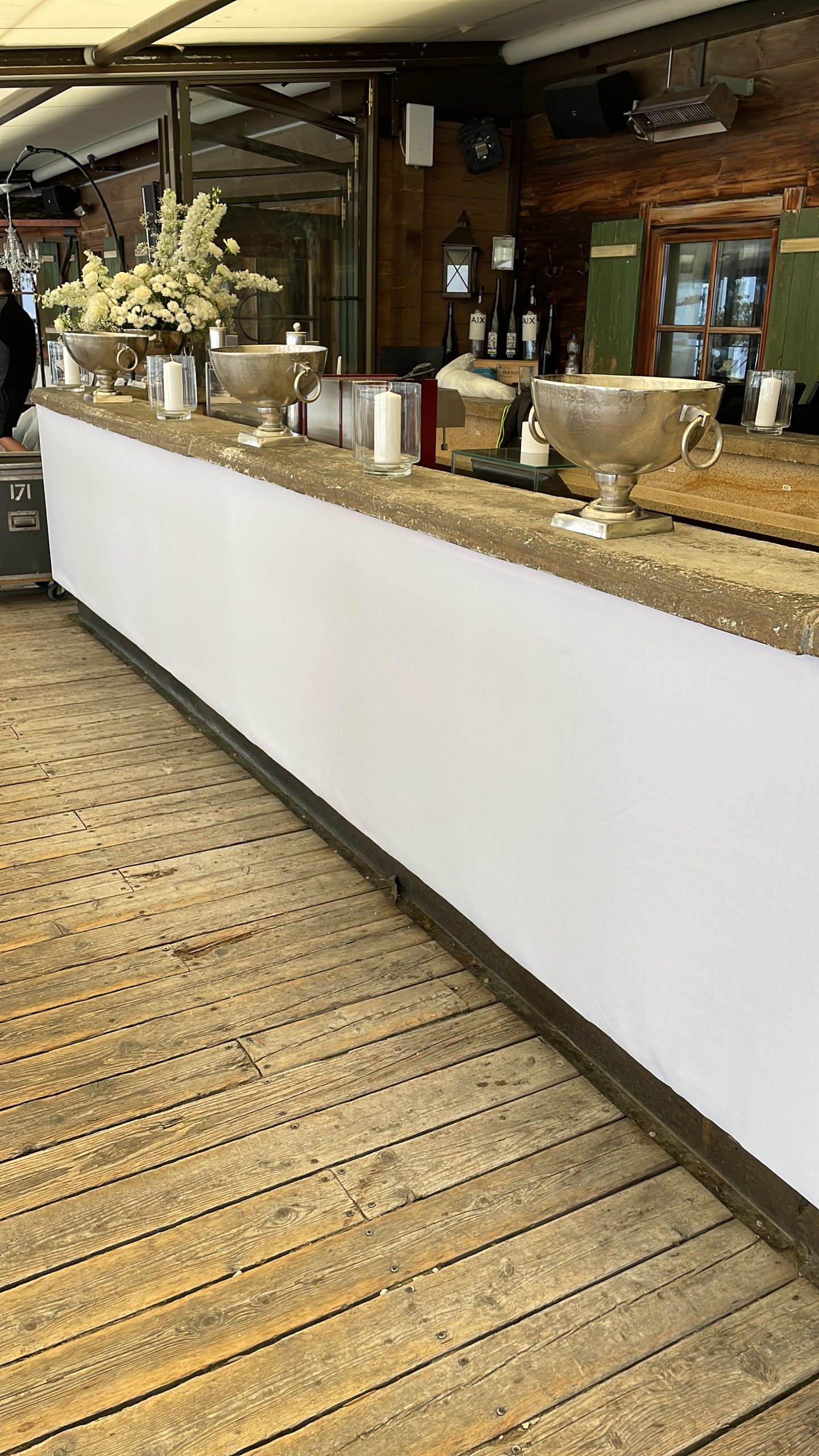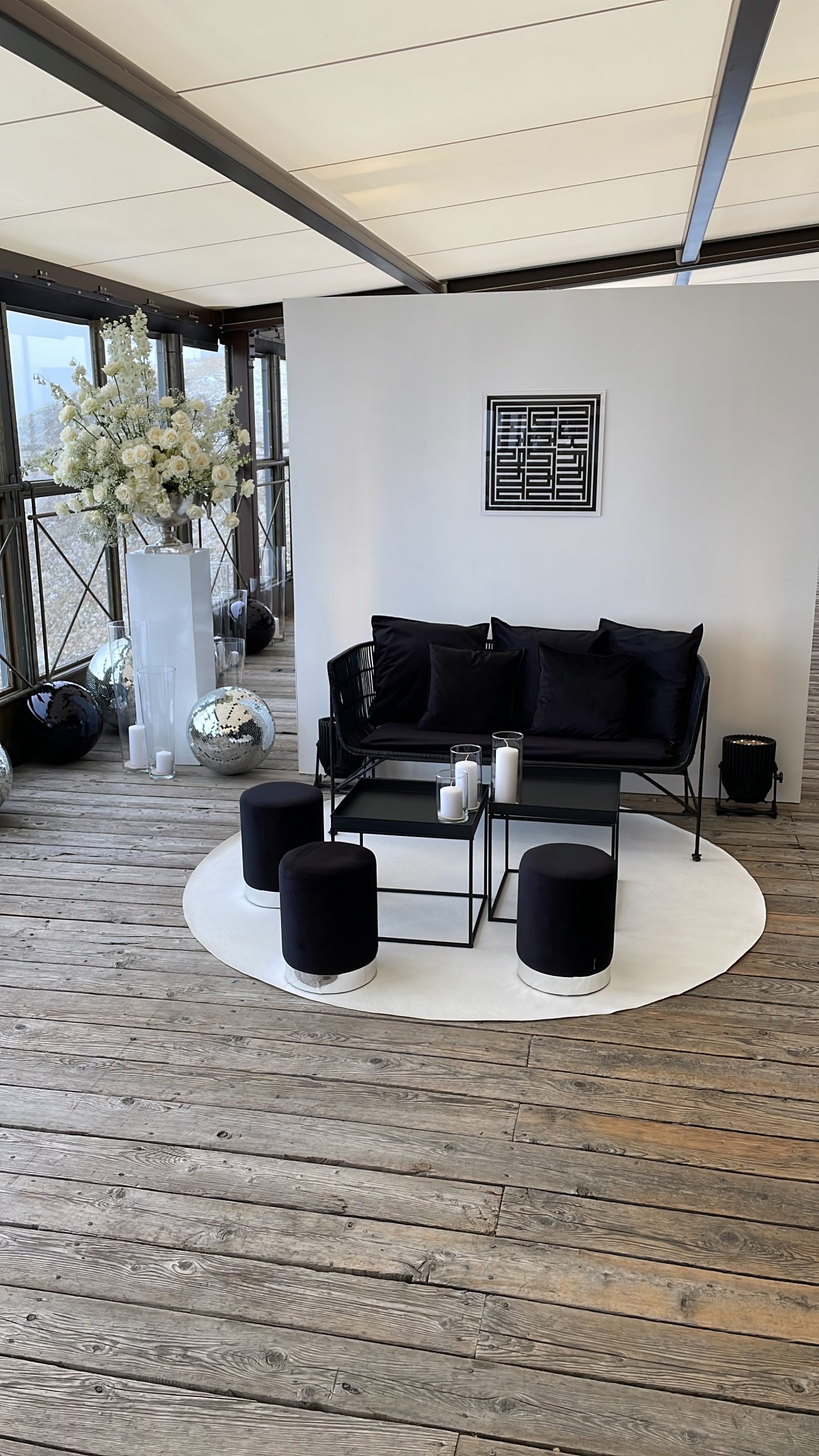 Auch der Lounge-Bereich ist von den Farben schwarz, weiß/creme und silber geprägt. Vor der Rückwand als Raumtrenner können die Gäste auf den Loungemöbeln Platz nehmen. Dazu verzieren Diskokugeln in schwarz und silber den gesamten Raum und sorgen für funkelnde Lichteffekte. Zusätzlich sorgen im Außenbereich unsere Lampengestelle mit den passenden Kronleuchtern zu Beginn der Dämmerung für eine romantische Bergstimmung.