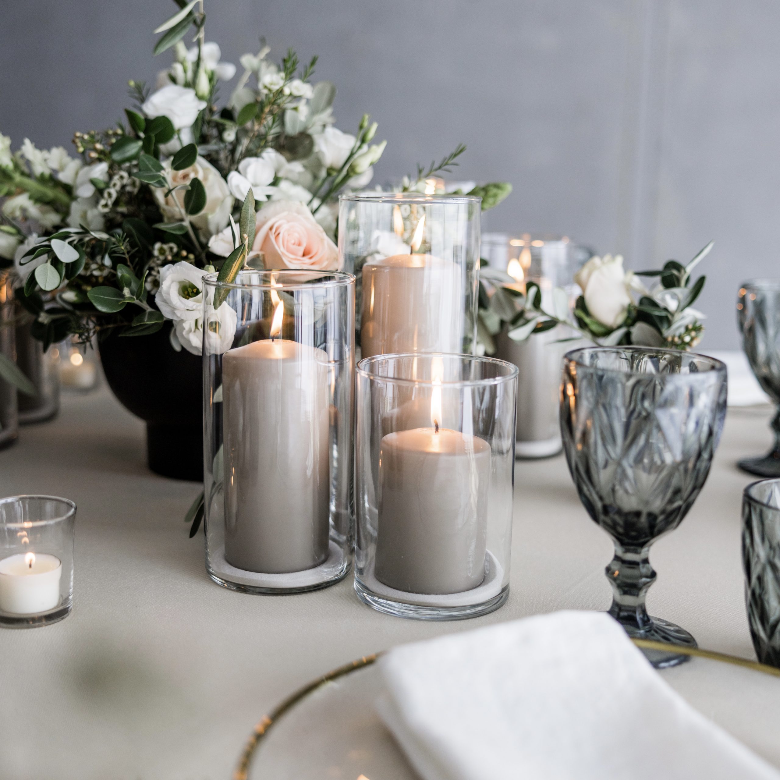 Diese Glaszylinder sind romantisch und zeitlos. Sie können wunderbar mit Kerzen kombiniert werden und den Tisch in Szene setzen.