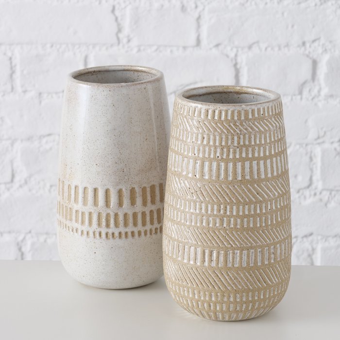 Ein Set besteht aus zwei formschönen Vasen in einem lässigen Design. Die Vasen passen zum Cosy-Boho Look und lassen die Blumen strahlen.