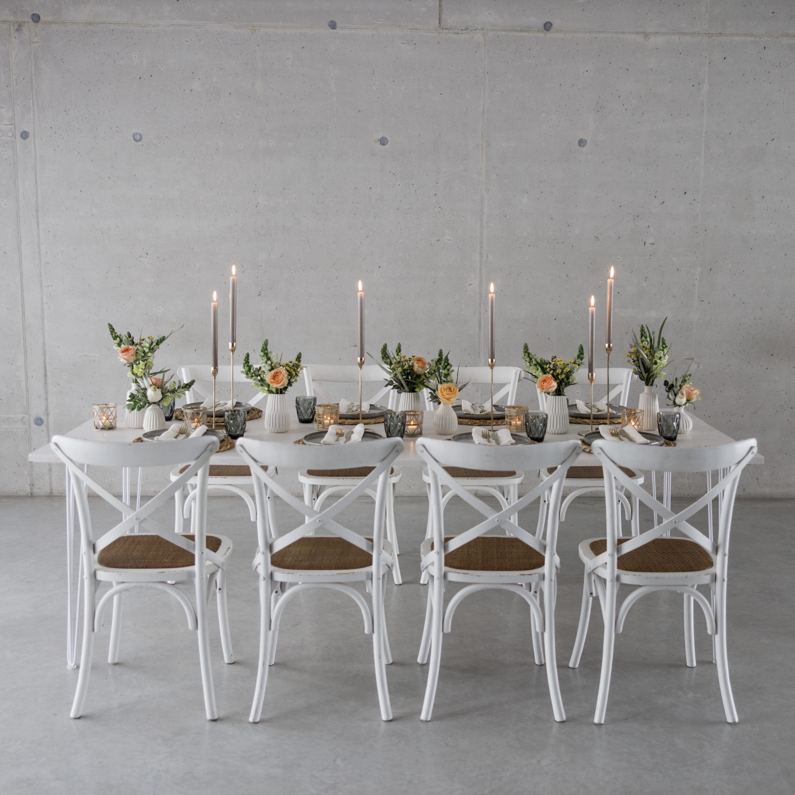 Freundliche, ruhige Farben in Verbindung mit goldenen Kerzenhaltern ergeben diesen Look. Holt euch mit diesem Dekokonzept die Leichtigkeit eines skandinavischen Sommers auf eure Hochzeitstafel. Helle Farben und natürliche Materialien stehen im Mittelpunkt dieses Tischsets. Dies unterstreichen z.B. die Teelichthalter oder Platzsets zusammen mit farbigen, fröhlichen Kerzenfarben. Auch die passenden Servietten in Leinen, mit den Farben natur oder hellgrau, könnt ihr bei uns dazu leihen.