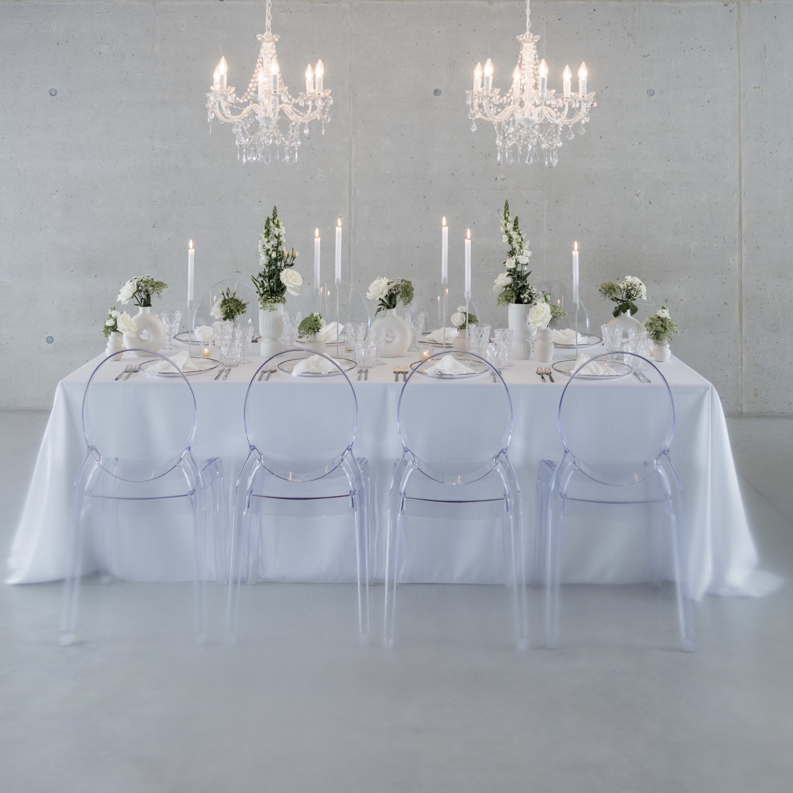 Weiße Eleganz trifft auf romantische Formen. Zaubert euch mit diesem Konzept einen schlichten und doch verzaubernden Dekolook auf eure Tische. Die weißen Stabkerzenhalter, zusammen mit einigen Teelichtern verteilt über eure Hochzeitstafeln, lassen den Raum glitzern. Passend dazu sind die modernen Formen der Vasen, mit hellen Blumen gefüllt. Um das Dekokonzept noch abzurunden könnt ihr die passende Tischwäsche und Servietten dazu buchen. Auch die Platzteller mit goldenem oder silbernem Rand können für zusätzliches entzücken eurer Gäste sorgen und können zugemietet werden.