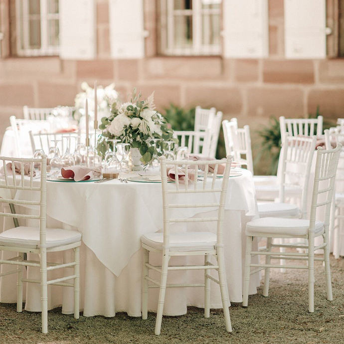 Unsere Chiavari Chairs aus Holz geben eurer Feier den perfekten Look. Elegant, verspielt und trotzdem super Modern. Das Sitzkissen in weiß ist im Mietpreis enthalten.