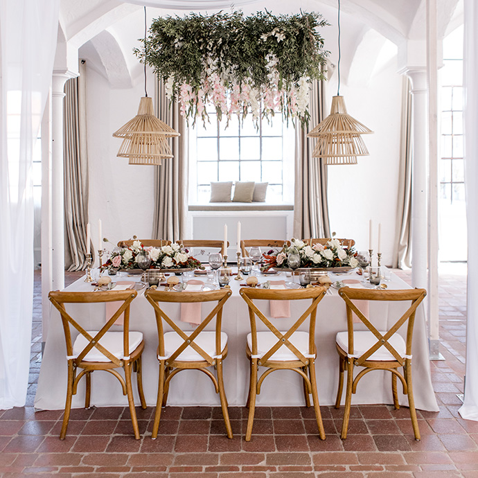 Ein absoluter Hingucker sind unsere braunen Crossback Chairs aus Eichenholz. Sie passen zu jeder Feier. Die weißen Sitzkissen sind im Mietpreis inbegriffen.