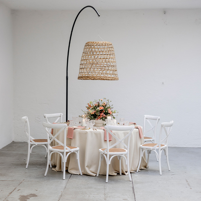 Einfach nur schön sind die die weißen Cross Back Chairs. Durch ihren schlichten Look und eine gemütliche Rattansitzfläche, passen sie zu jedem Deko-Look. Für diesen Stuhl wird kein Sitzkissen benötigt. Ihr wollt doch ein Kissen? Dann könnt ihr dieses einfach mieten. Die Optik mit bewusst gesetzten Gebrauchsspuren macht den Eindruck, dass der Stuhl schon lange benutzt wird, was zu einer lebendigen Ausstrahlung führt.
