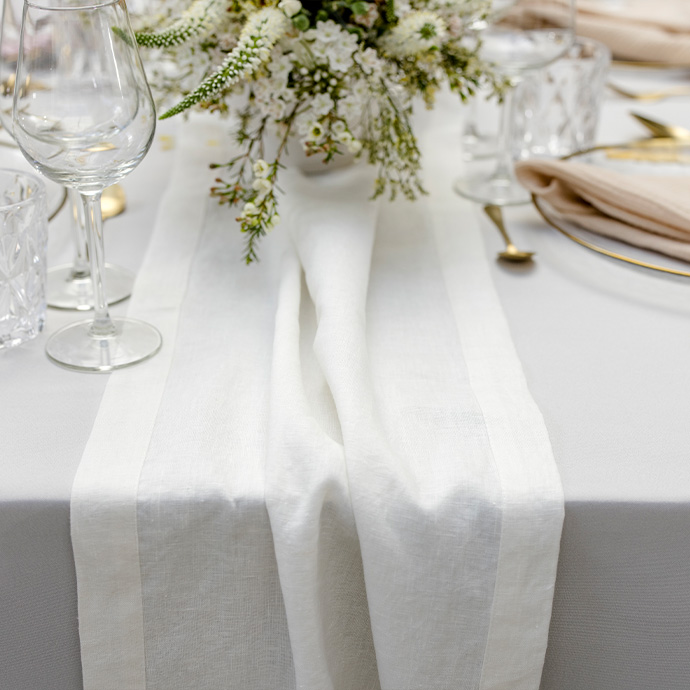 Tischläufer zaubern das gewisse Etwas auf den Dinner Tisch. Unsere Tischläufer aus Leinenstoff lockern die Dekoration auf und passen perfekt zu unseren Servietten.